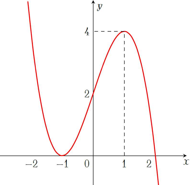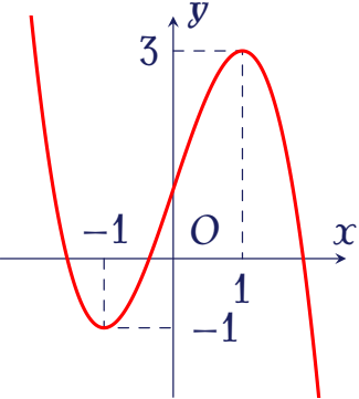 Cho hàm số $y=ax^3+bx^2+cx+d$ ($a,\,b,\,c,\,d\in\mathbb{R}$) có đồ thị là đường cong như hình vẽ bên.