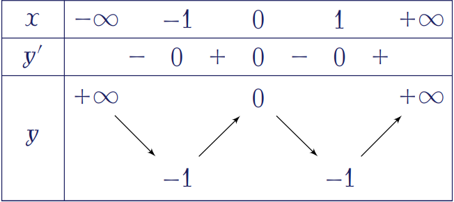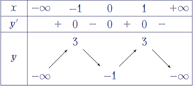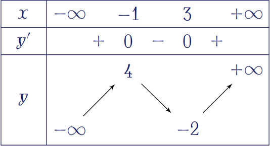 Cho hàm số $y=f(x)$ xác định trên $\mathbb{R}\setminus\{-1\}$, liên tục trên mỗi khoảng xác định và có bảng biến thiên như hình bên.