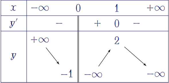Cho hàm số $y=f(x)$ xác định trên $\mathbb{R}\setminus\{0\}$, liên tục trên mỗi khoảng xác định và có bảng biến thiên như hình bên.