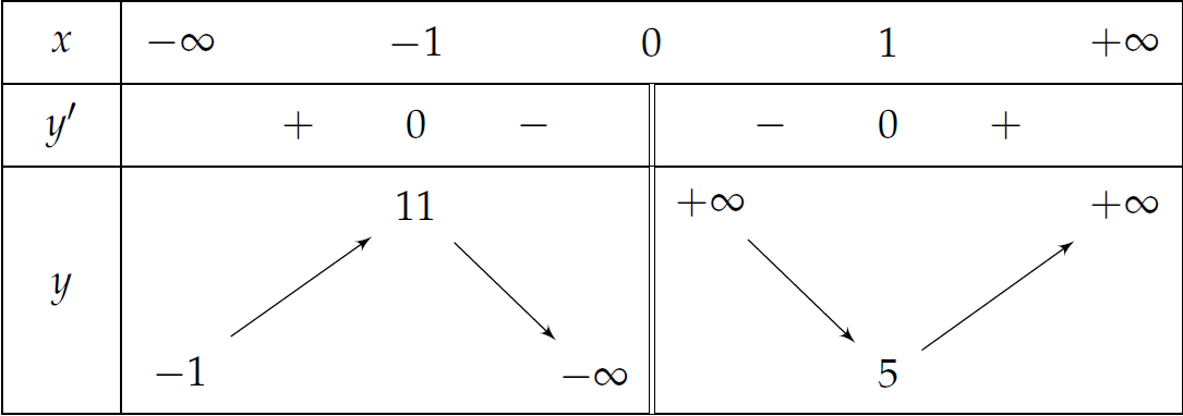 | Hàm số đồng biến trên \((-\infty;-1)\) và \((1;+\infty)\), nghịch biến trên \((-1;11)\) | |