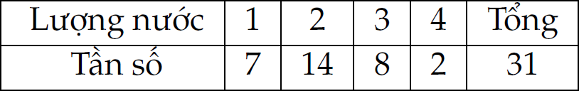 Bảng 1. Lượng nước bạn Bảo Anh đã uống trong 31 ngày (đơn vị: lít)