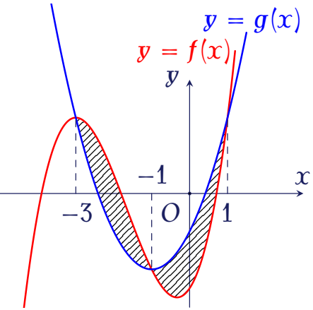 Cho hai hàm số $f(x)=mx^3+nx^2+px-\dfrac{5}{2}$ $(m,\,n,\,p\in\mathbb{R})$ và $g(x)=x^2+2x-1$ có đồ thị cắt nhau tại ba điểm có hoành độ lần lượt là $-3$, $-1$, $1$ (tham khảo hình vẽ).