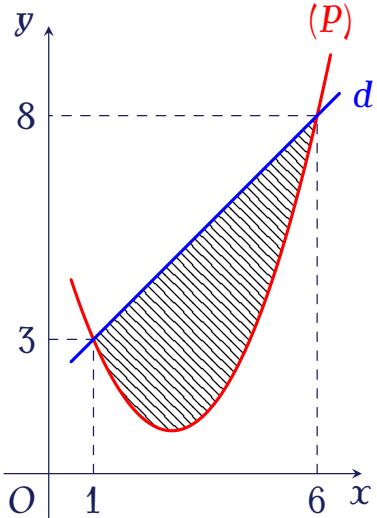 Biết rằng hình phẳng giới hạn bởi $(P)$ và $d$ có diện tích $S=\dfrac{125}{9}$. Tích phân $\displaystyle\displaystyle\int\limits_1^6(2x-5)f'(x)\mathrm{~d}x$ bằng