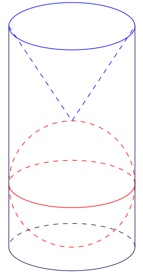 Trên bàn có một cốc nước hình trụ chứa đầy nước, có chiều cao bằng $3$ lần đường kính của đáy; một viên bi và một khối nón đều bằng thủy tinh. Biết viên bi là một khối cầu có đường kính bằng đường kính của cốc nước. Người ta từ từ thả vào cốc nước viên bi và khối nón sao cho đỉnh khối nón nằm trên mặt cầu (như hình vẽ) thì thấy nước trong cốc tràn ra ngoài.