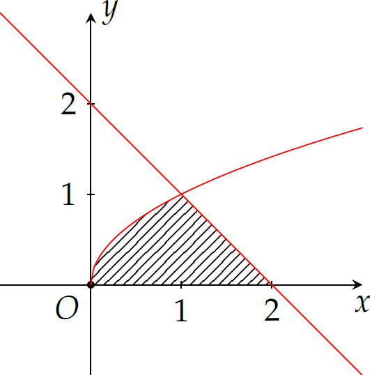 Cho \((H)\) là hình phẳng giới hạn bởi đồ thị của các hàm số \(y=\sqrt{x}\), \(y=0\), \(y=2-x\). Diện tích của \((H)\) là