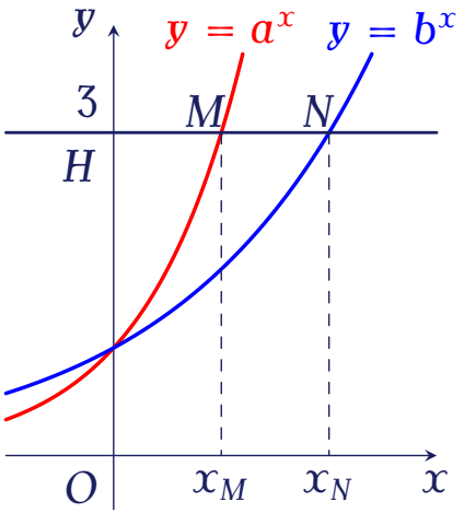 Đường thẳng $y=3$ cắt trục tung, đồ thị hàm số $y=a^x$, đồ thị hàm số $y=b^x$ lần lượt tại $H,\,M,\,N$. Biết rằng $HM=2MN$. Mệnh đề nào sau đây đúng?