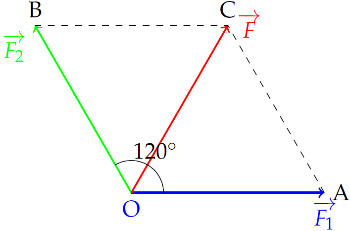Gọi \(C\) là đỉnh thứ tư của hình bình hành \(OACB\) ta có $$\overrightarrow{F_1}+\overrightarrow{F_2}=\overrightarrow{OA}+\overrightarrow{OB}=\overrightarrow{OC}$$