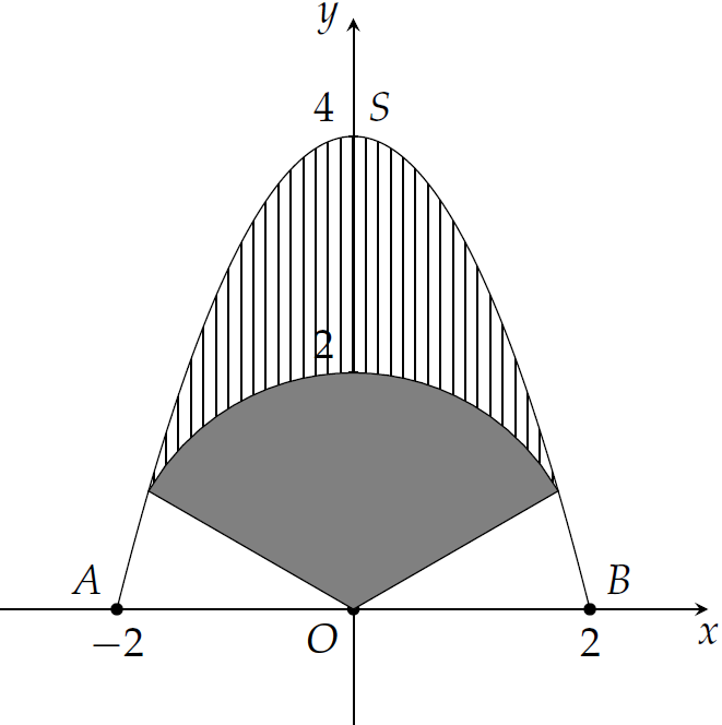 Khi đó, vì các điểm \(A(-2;0)\), \(B(2;0)\) và \(S(0;4)\) nằm trên parabol nên ta có phương trình là \(y=4-x^2\).