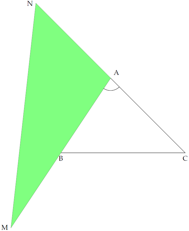 Do đó diện tích tam giác \(AMN\) bằng $$\begin{align*}\dfrac{1}{2}AM\cdot AN\sin\widehat{MAN}&=\dfrac{1}{2}2AB\cdot AC\sin\widehat{BAC}\\