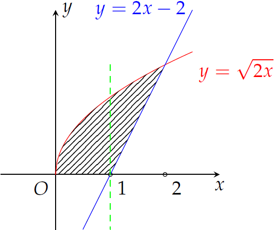 Cho \((H)\) là hình phẳng giới hạn bởi các đường \(y=\sqrt{2x}\), \(y=2x-2\) và trục hoành. Tính diện tích của \((H)\).