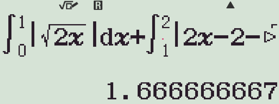 &=&\displaystyle\int\limits_0^1\sqrt{2}x^{\tfrac{1}{2}}\mathrm{\,d}x+\displaystyle\int\limits_1^2\left(\sqrt{2}x^{\tfrac{1}{2}}-2x+2\right)\mathrm{\,d}x\\