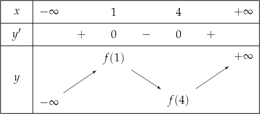 Cho \(f'(x)=0\Leftrightarrow\left[\begin{array}{l}x=1\\ x=4\end{array}\right.\)