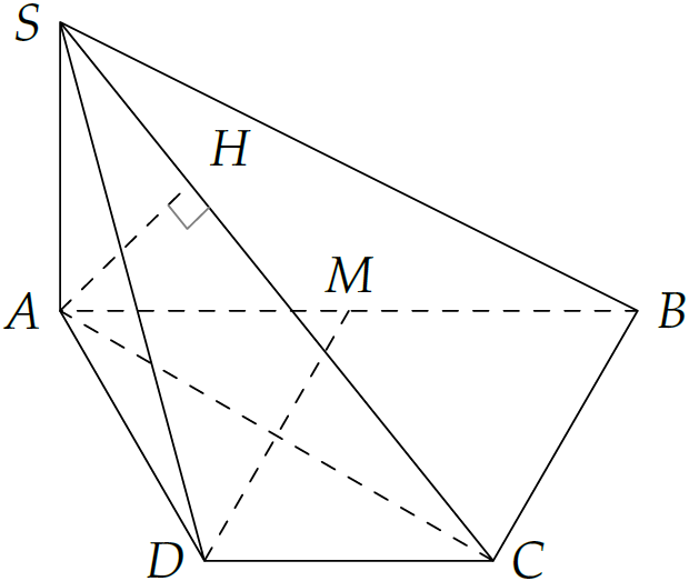 Cho hình chóp \(S.ABCD\) có đáy là hình thang, \(AB=2a\), \(AD=DC=CB=a\), \(SA\) vuông góc với mặt phẳng đáy và \(SA=3a\) (như hình minh họa trên). Gọi \(M\) là trung điểm của \(AB\). Khoảng cách giữa hai đường thẳng \(SB\) và \(DM\) bằng