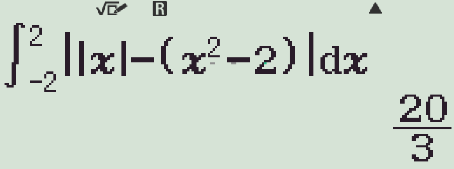 &=\displaystyle\int\limits_{-2}^{0}\left||x|-\left(x^2-2\right)\right|\mathrm{\,d}x+\displaystyle\int\limits_{0}^{2}\left||x|-\left(x^2-2\right)\right|\mathrm{\,d}x\\