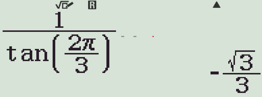 Suy ra \(\cot\dfrac{2\pi}{3}=\dfrac{1}{\tan\tfrac{2\pi}{3}}=-\dfrac{1}{\sqrt{3}}\).