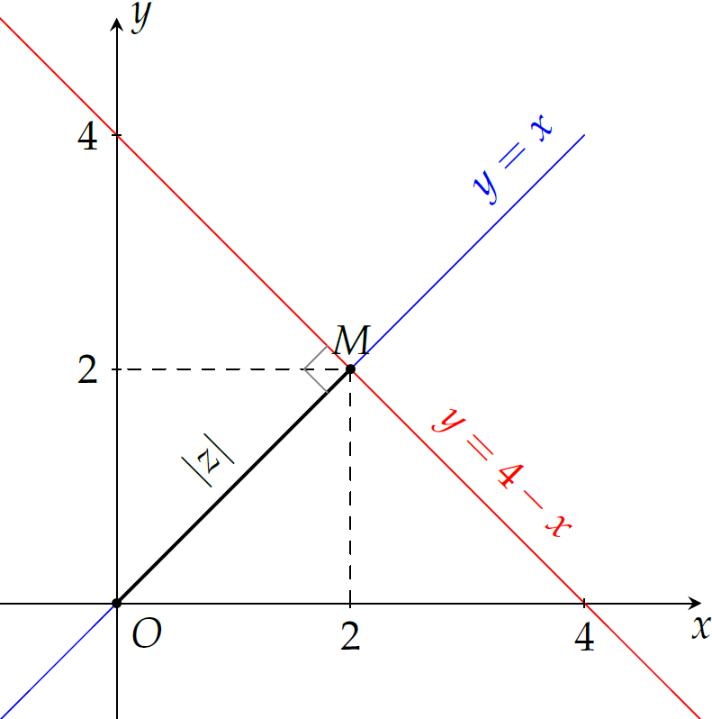 Vì \(|z|=OM\) nên \(|z|\) nhỏ nhất khi và chỉ khi \(OM\) ngắn nhất.