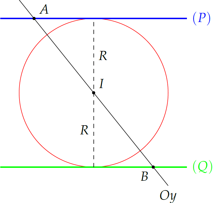 Gọi \(A,\,B\) lần lượt là giao điểm của \(Oy\) với \((P),\,(Q)\). Ta có