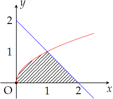 Tính thể tích khối tròn xoay được tạo bởi hình phẳng giới hạn bởi ba đường \(y=\sqrt{x}\), \(y=2-x\) và \(y=0\) quanh trục \(Ox\).