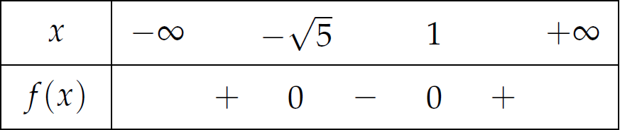 Theo đó, \(f(x)>0\) khi và chỉ khi \(x\in\left(-\infty;-\sqrt{5}\right)\cup(1;+\infty)\).