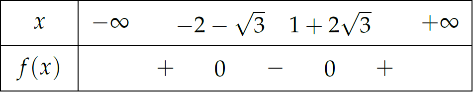 Theo đó, \(f(x)<0\) với \(x\in\left(-2-\sqrt{3};1+2\sqrt{3}\right)\).