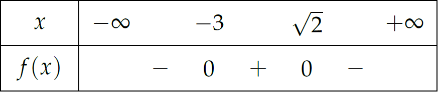 \(f(x)=0\Leftrightarrow\left[\begin{array}{l}x=-3\\ x=\sqrt{2}.\end{array}\right.\)