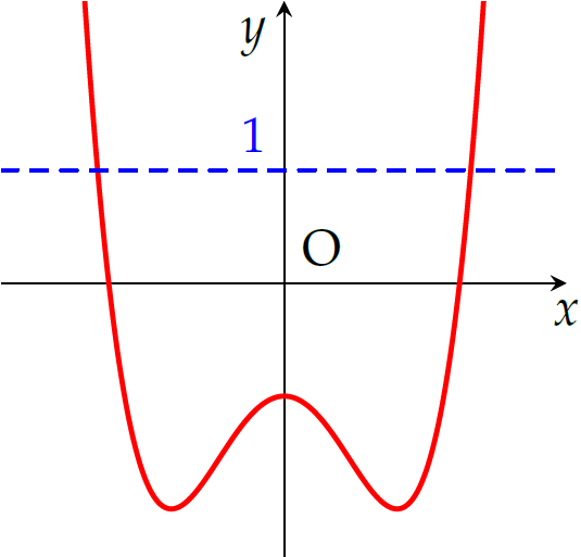 Mặt khác, vì đường thẳng \(y=1\) cắt đồ thị tại \(2\) điểm phân biệt nên phương trình \(f(x)=1\) có \(2\) nghiệm thực phân biệt.