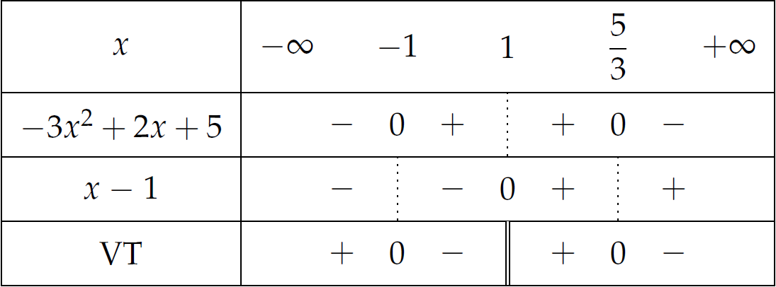 Tập nghiệm của bất phương trình \(\dfrac{-3x^2+2x+5}{x-1}\leq0\) là