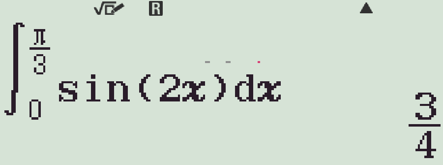 \(I=\displaystyle\int\limits_0^{\tfrac{\pi}{3}}\sin{2x}\mathrm{\,d}x=-\dfrac{1}{2}\cos2x\bigg|_0^{\tfrac{\pi}{3}}=\dfrac{3}{4}\).