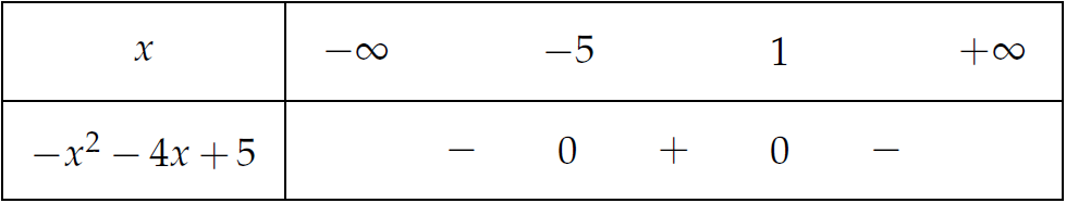 Cho tam thức bậc hai \(f(x)=-x^2-4x+5\). Tìm tất cả giá trị của \(x\) để \(f(x)\geq0\).