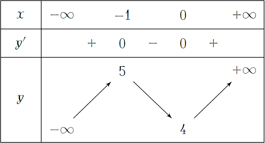 Cho \(y'=0\Leftrightarrow\left[\begin{array}{l}x=-1\\ x=0.\end{array}\right.\)