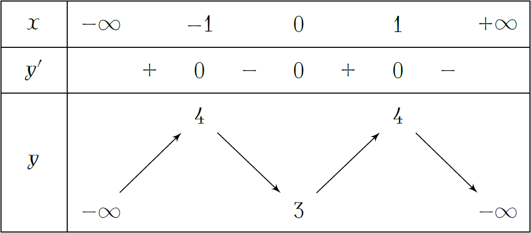 Cho hàm số \(y=-x^4+2x^2+3\) có giá trị cực đại và giá trị cực tiểu lần lượt là \(y_1,\,y_2\). Khi đó \(y_1+y_2\) bằng