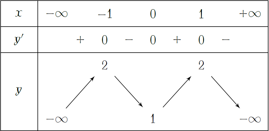 Xét hàm số \(y=-x^4+2x^2+1\) ta có $$y'=-4x^3+4x=4x\left(1-x^2\right).$$Cho \(y'=0\Leftrightarrow4x\left(1-x^2\right)=0\Leftrightarrow\left[\begin{array}{l}x=0\\ x=1\\ x=-1\end{array}\right.\)