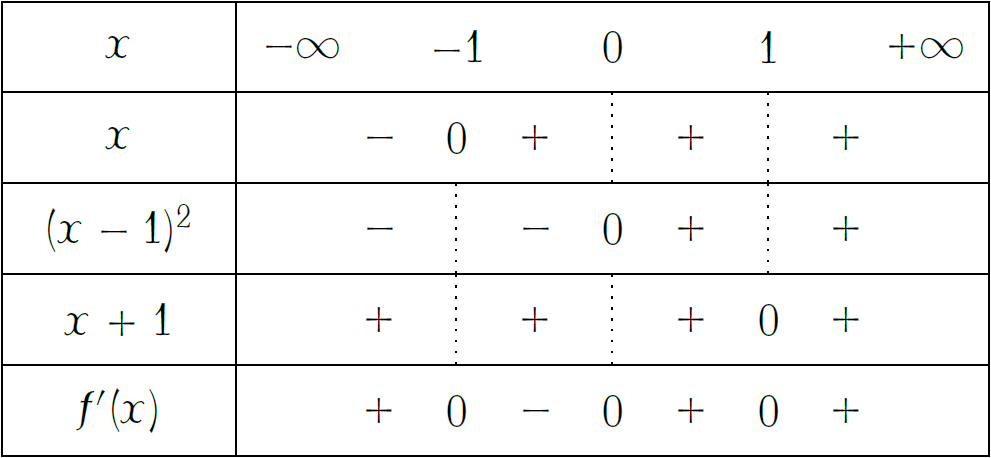Ta có \(f'(x)=0\Leftrightarrow\left[\begin{array}{l}x=0\\ x=1\\ x=-1\end{array}\right.\)