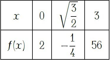 Cho \(y'=0\Leftrightarrow\left[\begin{array}{ll}x=0 &\in[0;3]\\ x=\sqrt{\dfrac{3}{2}} &\in[0;3]\\ x=-\sqrt{\dfrac{3}{2}} &\notin[0;3]\end{array}\right.\)