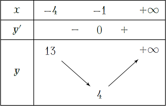 Ta có \(y'=2x+2\). Cho \(y'=0\Leftrightarrow x=-1\). Vậy \(\min\limits_{[-4;+\infty)}y=4\).