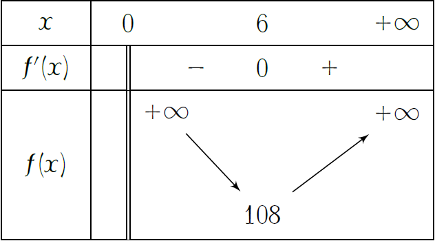 Cho \(f'(x)=0\Leftrightarrow2x^3-432=0\Leftrightarrow x=6\).