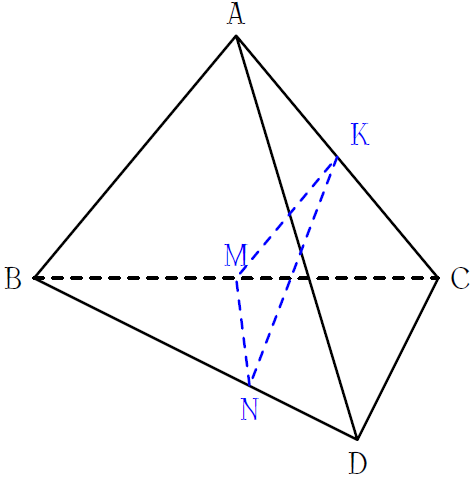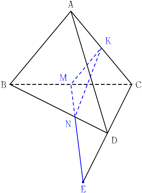 Cho tứ diện \(ABCD\). Gọi \(M,\,K\) lần lượt là trung điểm của \(BC\) và \(AC\), \(N\) là điểm trên cạnh \(BD\) sao cho \(BN=2ND\). Giao điểm của \(MN\) và \((ACD)\) là