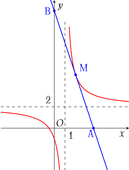 Tiếp tuyến của đường cong \(\left(\mathscr{C}\right)\colon y=\dfrac{2x+1}{x-1}\) tại điểm \(M(2;5)\) cắt các trục tọa độ \(Ox\), \(Oy\) lần lượt tại \(A\) và \(B\). Tính diện tích tam giác \(OAB\).