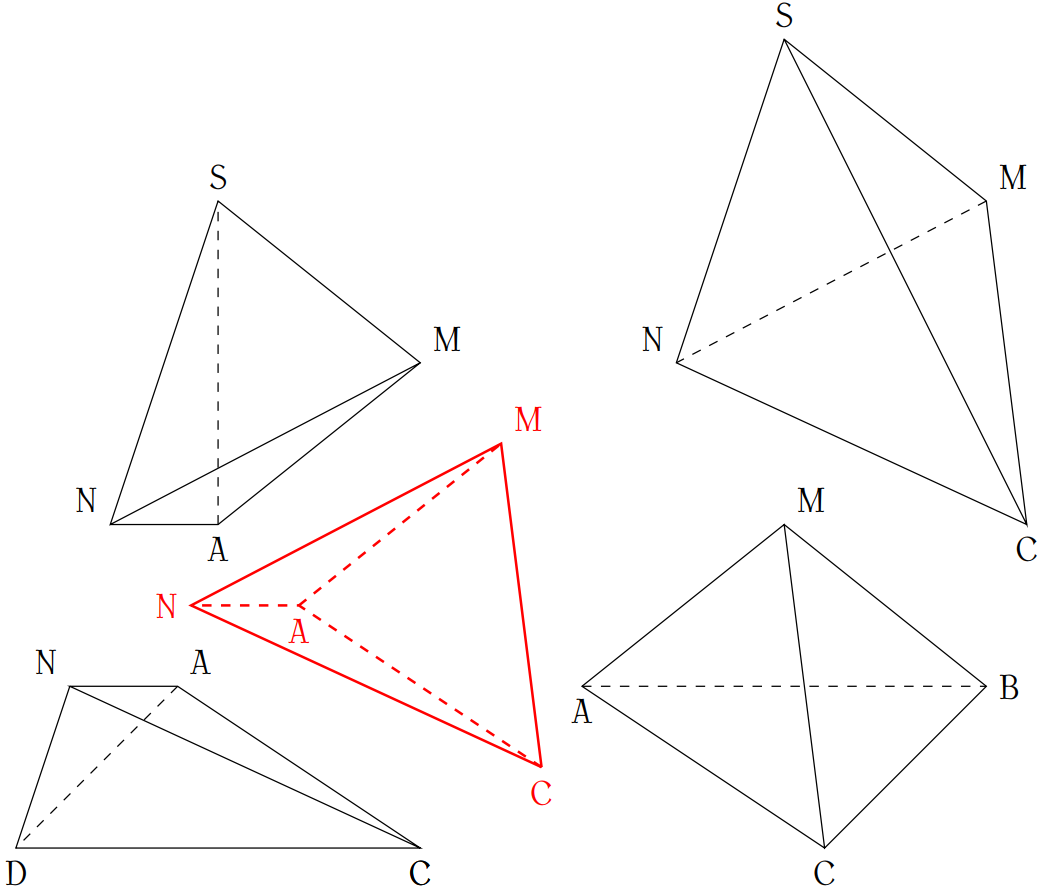 \Rightarrow V_{SAMN}&=\dfrac{1}{3}V_{S.ABD}=\dfrac{1}{3}\cdot\dfrac{a^3}{6}=\dfrac{a^3}{18}\;(2)