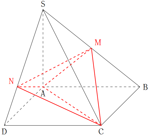 \dfrac{V_{S.ACN}}{V_{S.ACD}}&=\dfrac{SA}{SA}\cdot\dfrac{SC}{SC}\cdot\dfrac{SN}{SD}=\dfrac{2}{3}\\