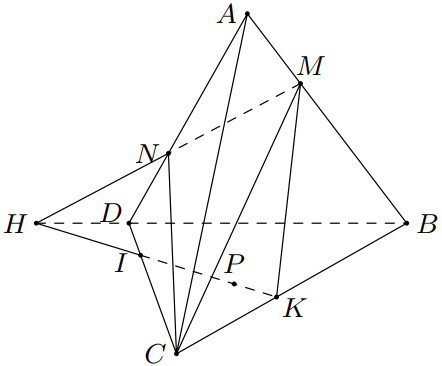Trong $(BCD)$, gọi $K=HP\cap BC$, khi đó $K\in(MNP)\cap(ABC)$ (2)