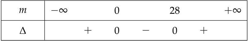 Vì $f\left(x\right)$ là tam thức bậc hai có $a=1>0$ nên để $f\left(x\right)\geq0$ với $\forall x$ thì $$\Delta\leq0\Leftrightarrow m^2-28m<0$$