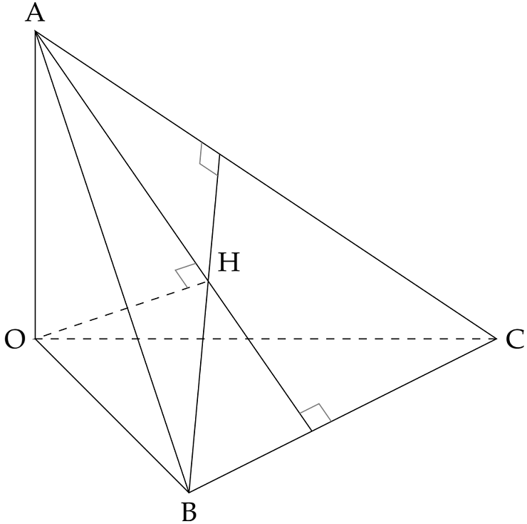 Cho tứ diện $OABC$ có $OA$, $OB$, $OC$ đôi một vuông góc. Gọi $OH$ là đường cao của tứ diện. Khi đó $H$ là