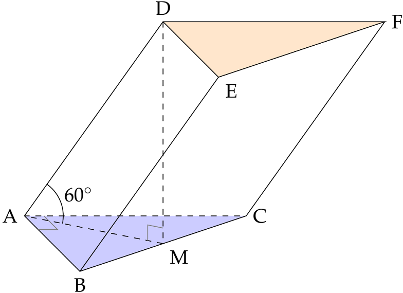 Theo đề ta có $DM$ chính là đường cao của hình lăng trụ.
