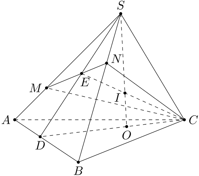 Ta có $\begin{cases}I\in EC,\,EC\subset(CMN)\Rightarrow I\in(CMN)\\ I\in SO\end{cases}$