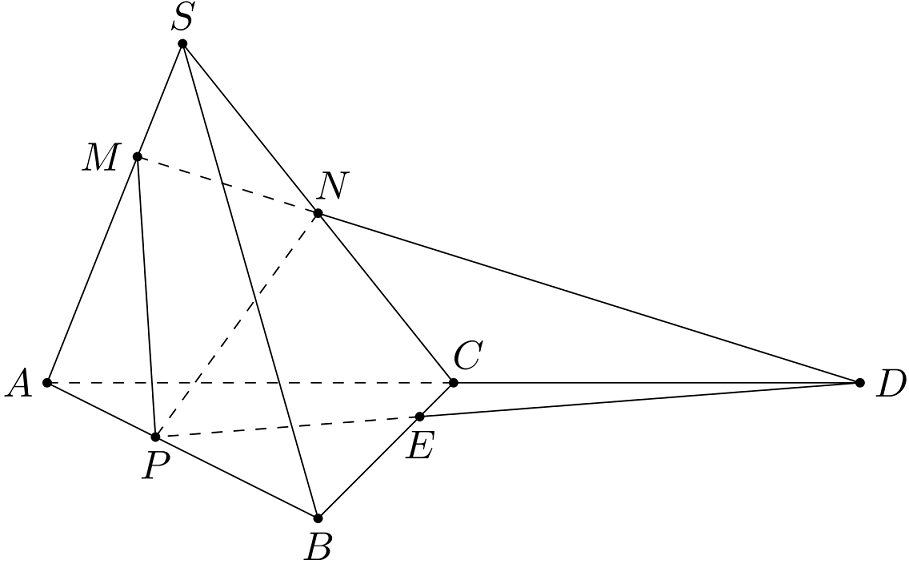 Cho hình chóp $S.ABC$. Trên cạnh $SA$ lấy $M$ sao cho $SA=3SM$, trên cạnh $SC$ lấy điểm $N$ sao cho $SC=2SN$. Điểm $P$ thuộc cạnh $AB$. Hãy tìm