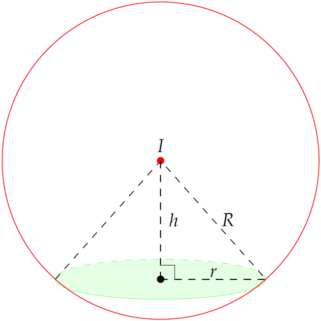 Gọi \(h\) là khoảng cách từ tâm \(I\) đến mặt phẳng \((P)\) và \(r\) là bán kính đáy của hình nón. Ta có: