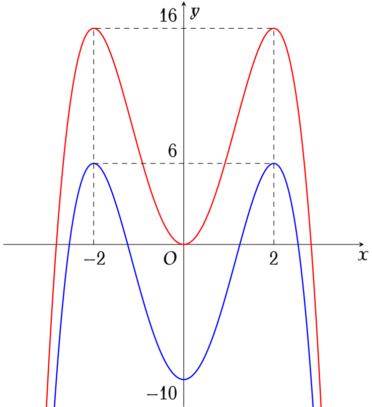Ta cần tìm $m$ sao cho đường thẳng $y=m$ cắt các đồ thị $g(x)=-x^4+8x^2$ và $h(x)=-x^4+8x^2-10$ tại $6$ điểm phân biệt khác $0$ và $\pm2$ (*).
