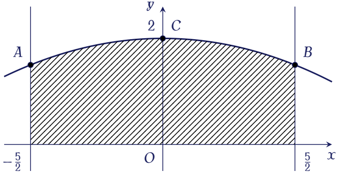 Ta có $S=\displaystyle\int\limits_{-\tfrac{5}{2}}^{\tfrac{5}{2}}\left(-\dfrac{2}{25}x^2+2\right)\mathrm{d}x=\dfrac{55}{6}$.