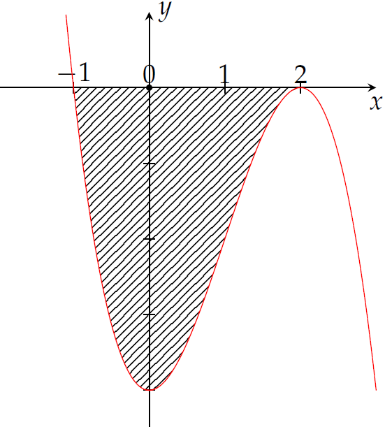Tính diện tích \(S\) của hình phẳng giới hạn bởi đồ thị hàm số \(y=-x^3+3x^2-4\) và trục hoành.